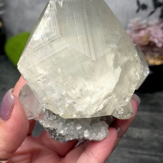 Large hexagonal calcite crystal!! Full of rainbows.. it sits upon some smaller calcites and quartz.
