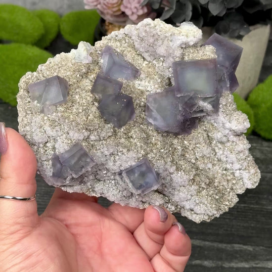 Beautiful green fluorite with purple edging/zoning, with smaller clear fluorite cubes and a heavy "dusting" of pyrite. Stunning statement piece!