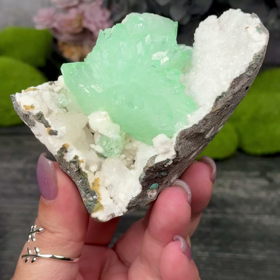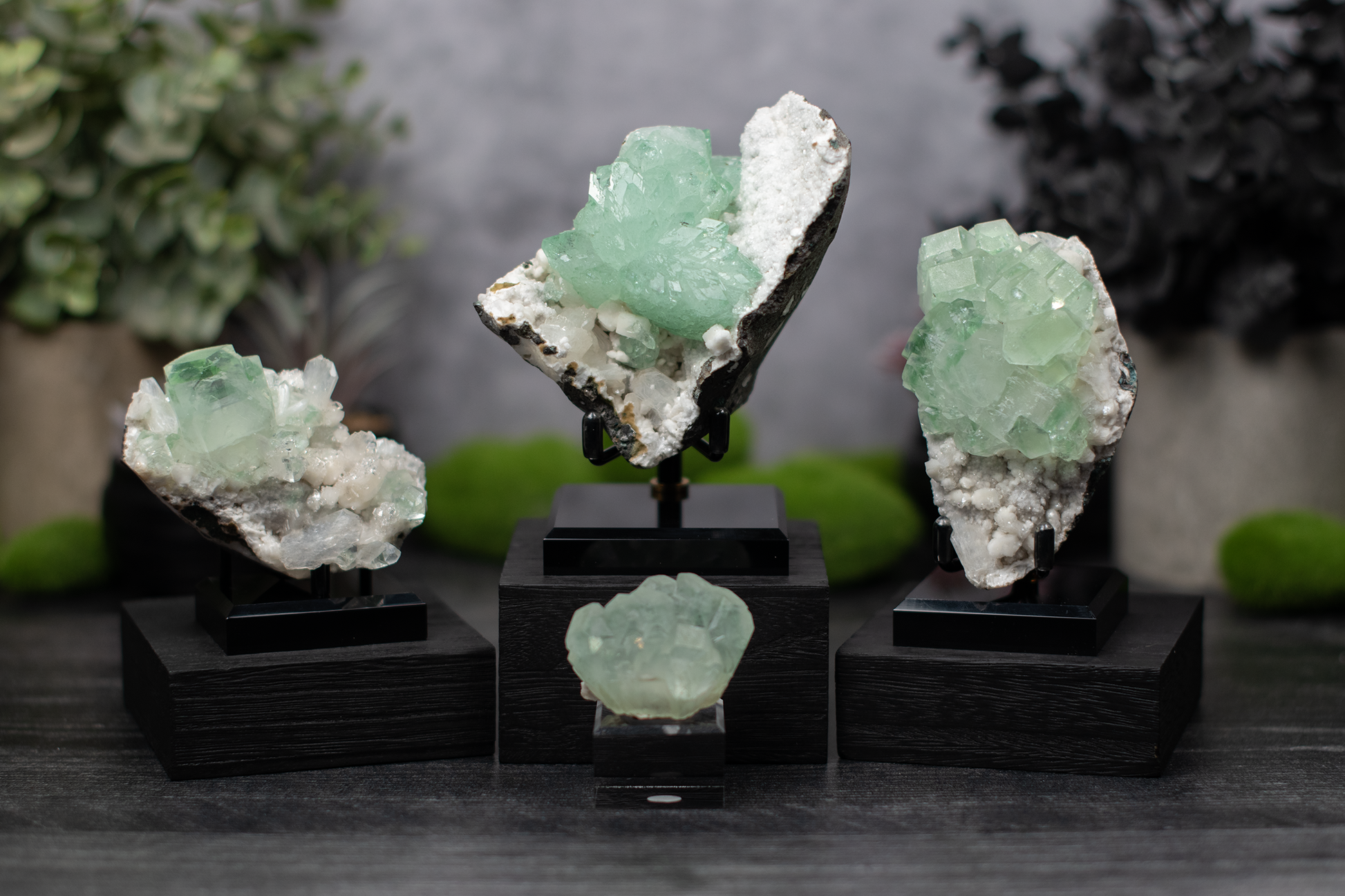 Gemmy, high grade green apophyllite, clear stilbite and mini clear apophyllite, all on bright white chalcedony. Some of India's finest in this lot!!