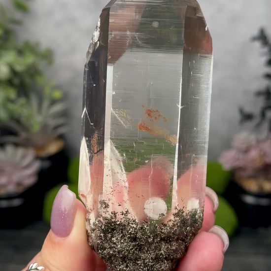 Chlorite and hematite included large Himalayan Quartz point. From a recent find, 20,000' above sea level. These are unique with the highest quality clarity, dark chlorite inclusions and hematite splotching!! This is our best piece left out of the entire lot!