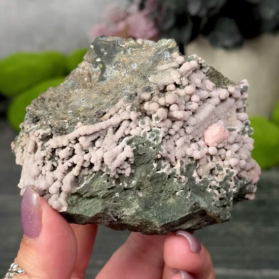 Gorgeous botryoidal rhodochrosite. These are so unique on the green/grey matrix!