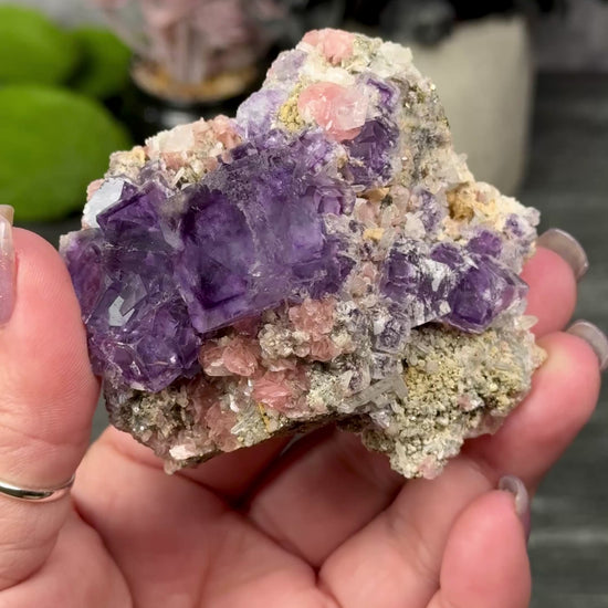 Fluorite, rhodochrosite, apatite, quartz.. a stellar combination from this locale. Large, well-zoned, stepped corner fluorite cubes and gemmy rhodochrosite.. a definite collector piece!