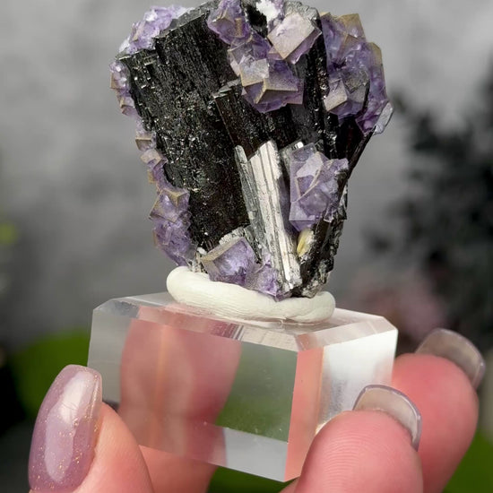 Pyrite dusted purple fluorite on lustrous black wolframite.. a stellar double sided piece!
